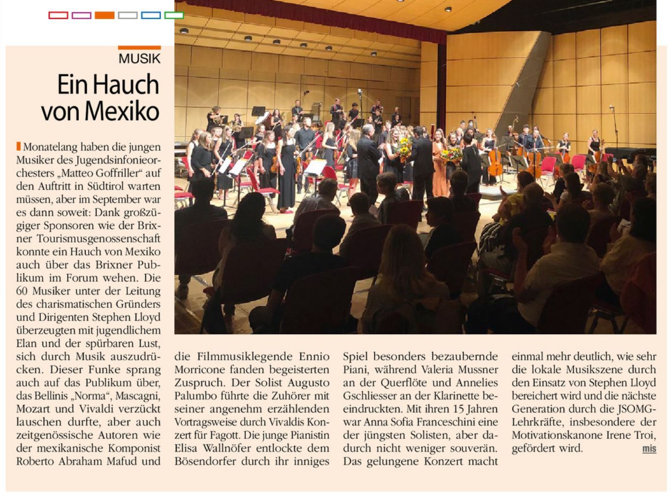 Article in "Brixner" No. 368 A Touch of Mexico The young musicians of the Matteo Goffriller Youth Symphony Orchestra had to wait months for their performance in South Tyrol, but in September the time had finally come: Thanks to generous sponsors such as the Brixen Tourism Association, a touch of Mexico was able to waft over the Brixen audience at the Forum. The 60 musicians, under the direction of the charismatic founder and conductor Stephen Lloyd, impressed with youthful vigor and a palpable desire to express themselves through music. This spark also spread to the audience, who were delighted to listen to Bellini's "Norma," Mascagni, Mozart, and Vivaldi. Contemporary composers such as the Mexican composer Roberto Abraham Mafud and film music legend Ennio Morricone also received enthusiastic acclaim. Soloist Augusto Palumbo led the audience through Vivaldi's Concerto for Bassoon with his pleasantly narrative style. The young pianist Elisa Wallnöfer coaxed particularly enchanting pianos from the Bösendorfer with her intimate playing, while Valeria Mussner on the flute and Annelies Gschliesser on the clarinet impressed. At 15, Anna Sofia Franceschini was one of the youngest soloists, but no less confident for that. The successful concert once again demonstrates how much the local music scene is enriched by the efforts of Stephen Lloyd and how the next generation is being nurtured by the JSOMG teachers, especially the motivational artist Irene Troi.
